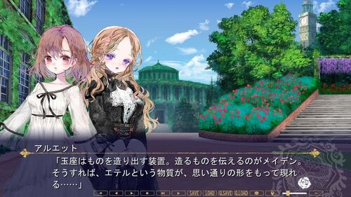 箱庭系ファンタジー百合学園モノ。物質生成能力を育成する女子学園の謎を解き明かせ。 主人公は突如謎の学園に舞い込んでくる異邦人。その時、聖母像への礼拝が行われていた。 その学園は下界から隔離されており、物質生成能力を持つ少女を育てているのだと…