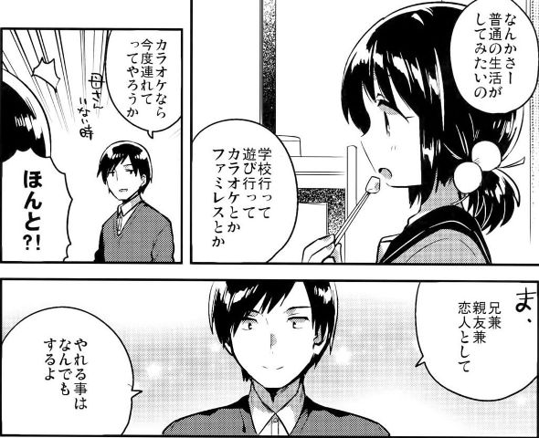 - 兄妹モノ。同じく退廃的な兄妹モノとしては三上ミカ先生の兄妹睡姦シリーズものが有名ですが、三上ミカ先生のものがハッピーエンドなのに対して、いちはや先生の方は設定が救いようがありません。妹がとても明るい性格なだけに余計に、そのギャップが救いようのなさを強調しています。話の流れは以下のような感じ。病弱なイモウトのために行動する兄が、次第に懇ろな仲になっていく展開。しかし、兄は自分のことを「妹が回復し、きちんとした友達や彼氏を作るまでの代用品」として見なしていました。ゆえに「妹のためには何でもしてやりたかった」と、妹に求められることで身体を重ねていたので、どこか理性で自制していたのです。つい本能的に妹を貪ってしまった時には「本気でしてくれてる感じがして嬉しかった」と喜ばれるほど。