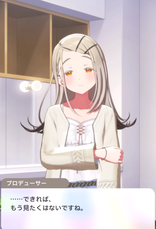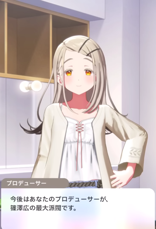- なんとか公演をやり切った広。学Pは珍しく広のライブに満足するのだが限界を迎えた広は吐きそうになってしまう。吐瀉物を浴びながらも学Pが迅速に処理したおかげで何とかなったが、またひとつ広は学Pに恥ずかしいところを見られてしまったときゅんきゅんする。ゲロを吐いたことで落ち着いた広は学Pと今後の方針について打ち合わせ。目下の課題として篠澤広教徒の信者たちの教義問題があった。謎ルールを持ち出しては古参の信者ぶり新規ファンを脅かす厄介者と化していたのだ。これに対し学Pは公式宗派を作ることを提案。シンプルで分かりやすく敷居の低いルールしかない公式派閥を結成し信徒の拡大を目指すことにしたのだ。最大派閥はあなたのプロデューサーと言う学Pに対し、篠澤広は最初からそうだったよとべたぼれで返す。二人のイチャラブっぷりがすごい。