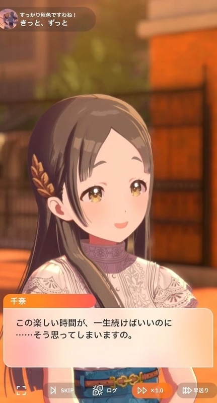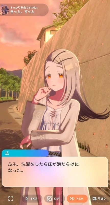 ラストは帰路。広に寮暮らしについて聞く千奈。だが広はあんまり寮生活に慣れていないと言う。馴染めてないのか!?とプレイヤーの間では一瞬不安が心をよぎったが、なんてことはなくただ半年近く経っても生活力が身についていないだけであった。広いわく洗濯しようとしたら床が泡だらけになったという。広は頭では分かっていても失敗ばかりな日常生活を大いに楽しんでいた。それを聞いた千奈はとても自分では寮暮らしなど出来ないという。リアルメイドにかしづかれて豪邸で生活する千奈には庶民生活は送れないかもしれない。だが広はちゃっかりと千奈との寮での相部屋暮らしフラグを立てていた。いつか実現する伏線なのかもしれない。終局部はずっとエンド。時々、千奈は思いつめたように告白ムーブをするが今回もそう。改まって、初星学園での生活が新鮮だと述べいつまでもこの時間が続けばいいのにと告げる。これを受けて広も真剣に答えて、自分も同じ気持ちであり、きっとずっと楽しい。思い出をたくさん作ろうと友情を確かめ合うのだ。こうして千奈と広はずっ友の誓いを交わした。