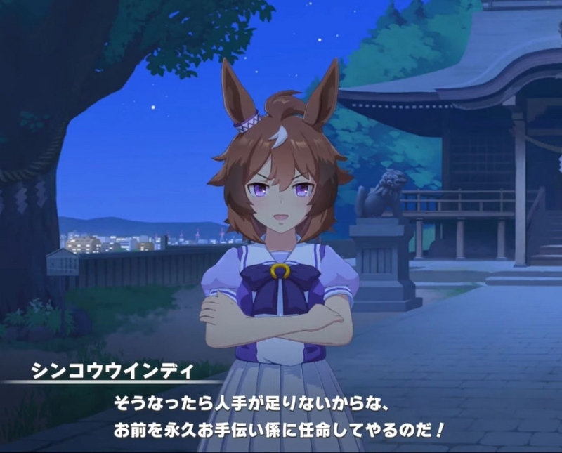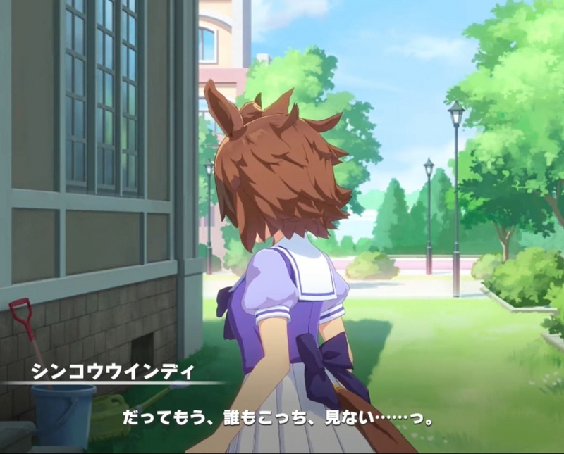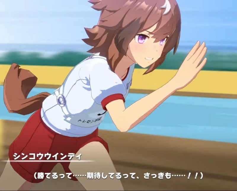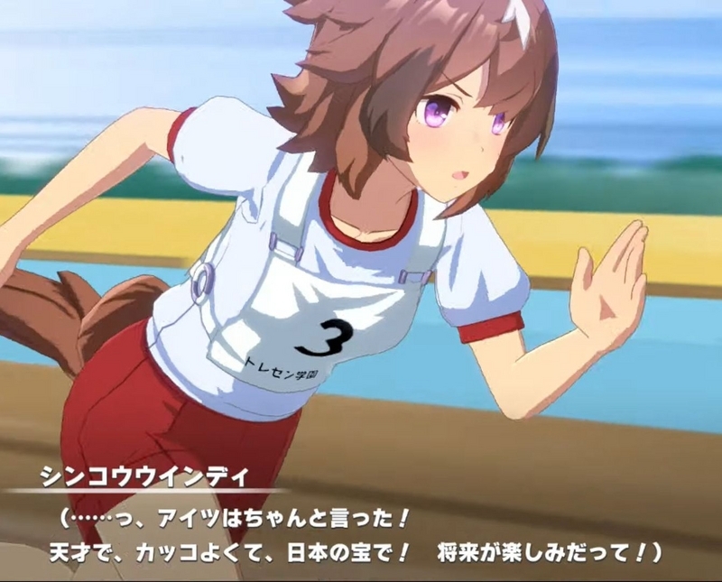 - シンコウウインディは悪戯大好きな悪の怪物。ある時主人公トレーナーはウインディの悪戯に引っかかり、噛まれた際に良い反応をしてしまう。このことをきっかけにして、ウインディからターゲットにされ、ことある毎に悪戯されてしまうことになる。ウインディは能力的にはイイものを持っていたのだが、自分が注目されないと苛立ってしまい集中力を欠き、なかなか結果を出すことが出来なかったのである。そのような中、トレーナーは研修で学園を留守にすることになりウインディの相手をできなくなってしまう。トレーナー不在の中、ウインディを構ってくれる人物など存在せず、トレセン学園の職員は逆にウィンデイに対して冷淡な態度を取るのであった。こうしてレースでも注目してもらえず、悪戯でも人の気を惹けないウインディはついに退学を考え始めるのであった。だがそこへ丁度良くトレーナーが研修から帰ってくる。事情を知ったトレーナーはウインディと真摯に向き合い、彼女と正面から話をする。ウインディの生い立ちや悪戯をする理由を知ったトレーナーはウインディの承認欲求を満たすことになる。ウインディが自信満々に語りながらも、次のレースで勝てると言い淀んだ際にトレーナーが被せる形で勝てるよ!と言うシーン良いよね。本シナリオ最大のクライマックスといっても過言ではない。トレーナーは陰に日向にウインディを助け、ついに選抜レースの日がやってくる。ウインディはいつになく集中してレースに取り組めたのだが、やはり観客の声が気になり誰も自分を見てくれないことで失意に駆られてしまう。そんなウインディに声援を送るのがトレーナーであり、この声で覚醒したウインディは集中力を取り戻し、見事レースで結果を出すことに成功した。